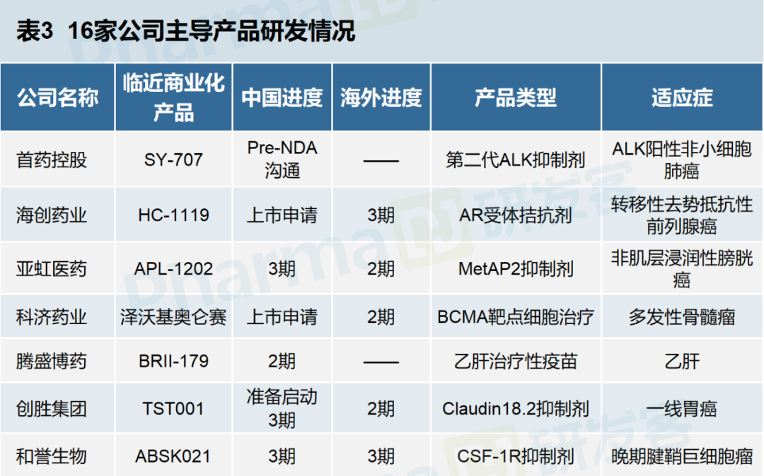 而一些企业因市场竞争格局变化,早前调整了产品的研发优先级别,如创胜集团的PD-L1抑制剂MSB2311,开拓药业的AR受体拮抗剂普克鲁胺,都已被置于管线的靠后位置,公司着手推进更有市场竞争力的产品开发(见表3)。