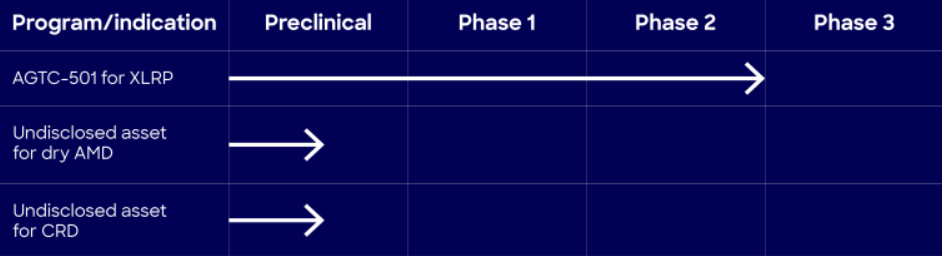 该公司的主导项目AGTC-501是一种用于治疗X连锁性色素性视网膜炎(XLRP)的基因疗法,目前正处于 II 期临床试验中。AGTC-501由眼科疾病基因治疗公司AGTC研发,2022年10月Syncona以8350万美元收购了AGTC。