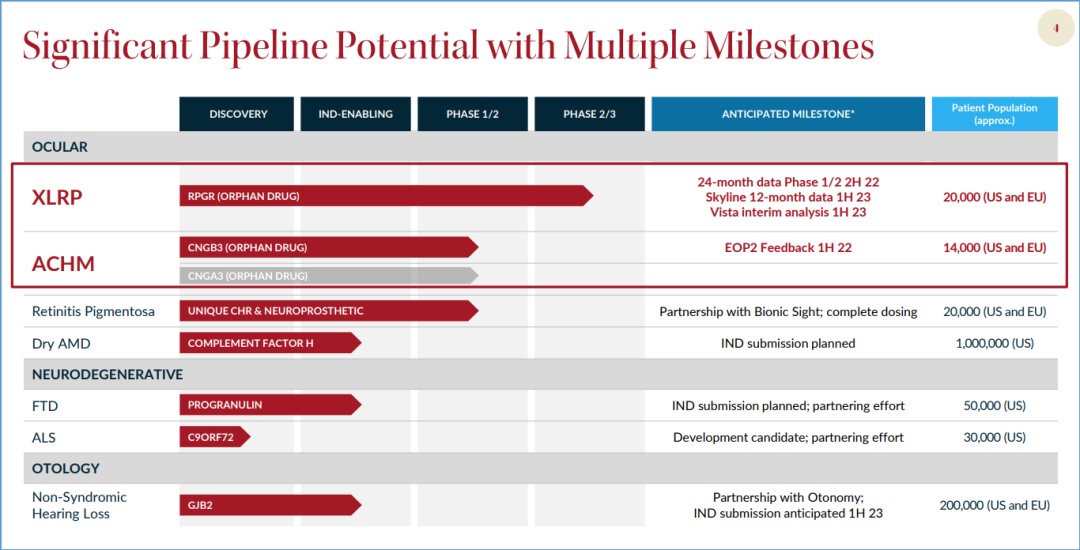 XLRP是一种遗传病,会导致患者渐进性视力丧失,包括儿童早期的夜盲症、视野的逐渐收缩,患者在疾病过程中视力会逐渐下降,导致40岁左右出现失明。AGTC-501 正确表达全长 RPGR 蛋白,从而解决由 XLRP 引起的光感受器损伤,包括视杆和视锥损失。预计 2023 年下半年Beacon公布AGTC-501 II 期 试验数据。
