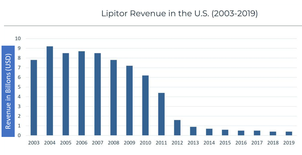 Liptor在其受专利保护的 14 年生命周期内为辉瑞创造了超过 1000 亿美元的收入,一度占据辉瑞年收入的25%。然而,当它的专利于 2011 年到期时,其全球销量下降了 71% 以上,造成了绝对的轰动效应。由于与仿制药的竞争,Liptor在美国的价格从每片上市价格 5 美元下降了 95% 至每片 31 美分。他们还通过各种授权的仿制药协议,推迟了阿托伐他汀(atorvastatin,Liptor的活性成分)仿制药的进入,导致 2018 年仿制药印度制药商 Ranbaxy Laboratories 和 CVS 的强烈反对。