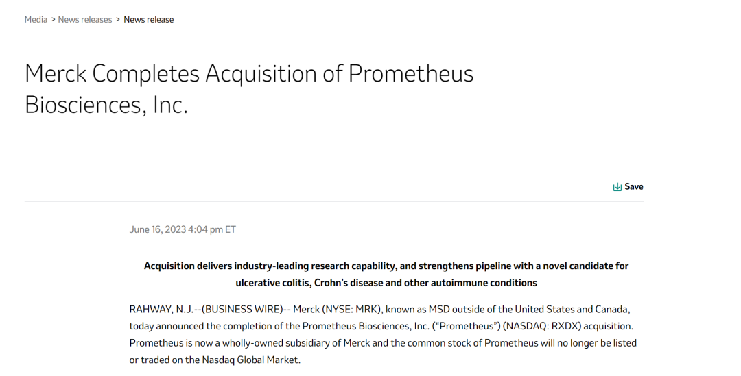 2023年6月16日,默沙东在一份新闻声明中表示,已经完成了对Prometheus Biosciences的收购,Prometheus已经从纳斯达克退市停止交易,并成为了默沙东全资子公司在运营。