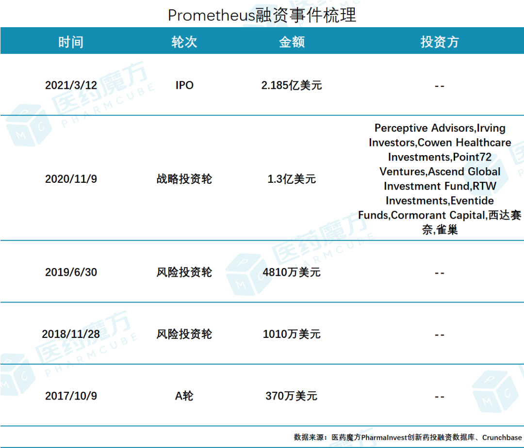 公开资料显示,2010年1月7日,Prometheus Laboratories曾经完成了一轮高达2.6亿美元的债权融资。