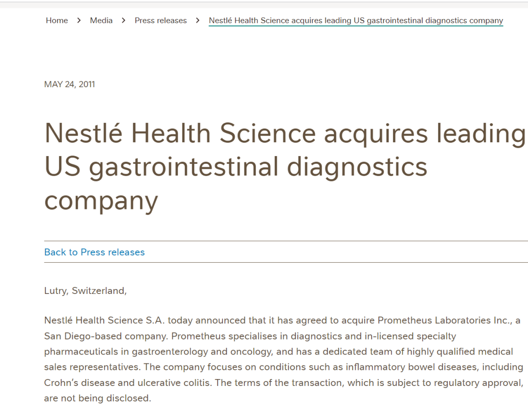 收购后不久,Joseph M. Limber便从雀巢健康科学离职,Prometheus Laboratories则一直在雀巢健康科学内部孵化直到2016年。
