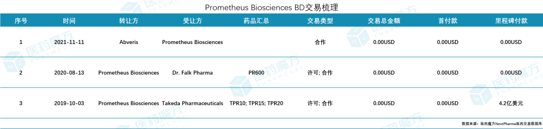 2023年4月16日,默沙东联合Prometheus Biosciences宣布,两家公司已经达成一项最终协议,默沙东通过其子公司将以每股200美元的价格收购Prometheus,对应收购总价约为108亿美元。仅2个月时间,该笔并购交易便落地完成。