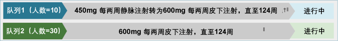 研究的两个队列中,队列1中的患者最初接受每两周一次450mg静脉注射给药,至少24周后转为每两周一次600mg皮下给药,总治疗持续时间长达124周。队列2中的患者接受每两周一次600mg皮下给药,总治疗时间长达124周。