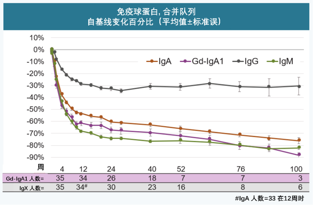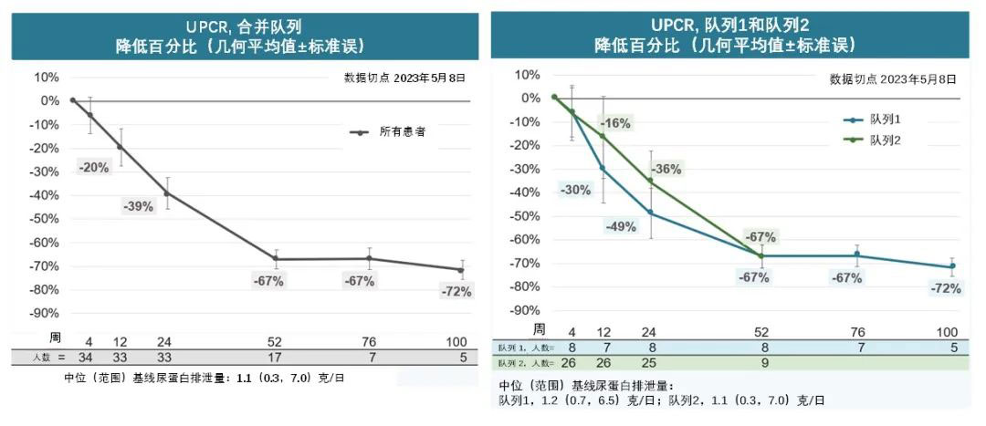 在合并分析的队列1和2的所有患者中,BION-1301在12周治疗时平均降低蛋白尿20%,24周时降低39%,52周时降低67%;BION-1301延长治疗可带给患者持续临床获益,在治疗76周时,7例患者的平均蛋白尿降低67%,在治疗100周时,5例患者的平均蛋白尿降低72%。