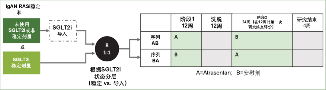 所有的合格受试者将按照1:1的比例随机分为AB序列或BA序列,其中他们将在一段时间内每天一次(QD)接受0.75 mg Atrasentan治疗,在另一段时间接受安慰剂治疗。随机分组将根据SGLT2i状态(稳定与导入)进行分层。所有受试者将进入治疗期1,为期12周,然后是12周的洗脱期,随后是治疗期2,为期24周。治疗结束后,患者接受约4周的安全性随访。
