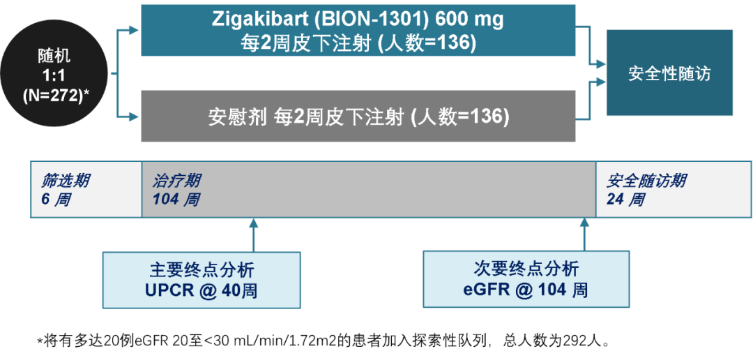 该研究的主要终点和次要终点分别是自基线至第12周和第24周的蛋白尿变化(24h-UPCR)。安全性评估包括不良事件的类型、发生率、严重程度和相关性。治疗期2自基线至第24周eGFR的变化将作为探索性终点进行评估。