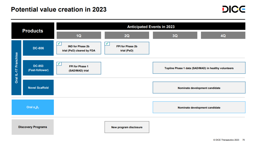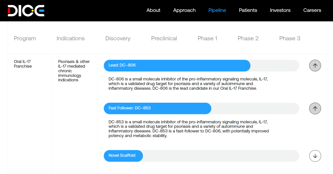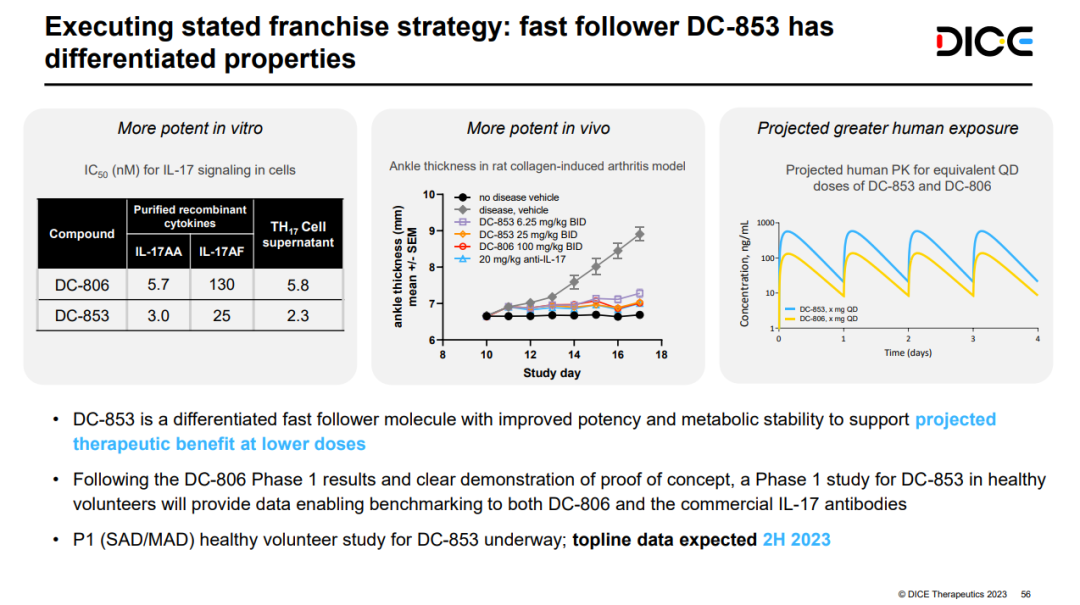 在 DICE 的口服 IL-17 抑制剂产品组合中,进展最快的 DC-806 已经推进到 II 期临床,此外还有 DC-853 在早期开发中,拥有差异化的活性和代谢稳定性。