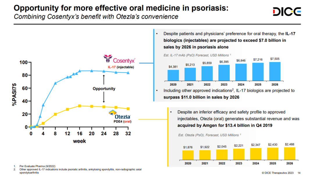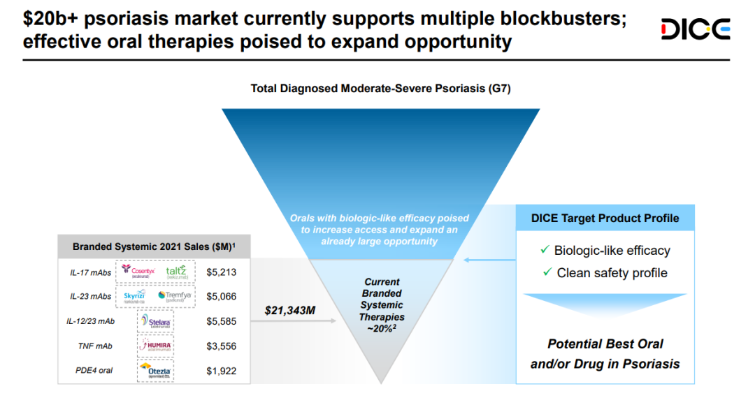 IL-17 是已验证的自身免疫领域靶点。目前已上市的 3 款同靶点药物以诺华的司库奇尤单抗(Cosentyx)为首,2022 年度 3 款药物共实现超 73 亿美元的全球销售额。不过,这些药物均为单抗类药物,采用皮下注射方式给药,DICE 则通过开发口服小分子药物为切入口,开发具有潜在差异化优势的新药。