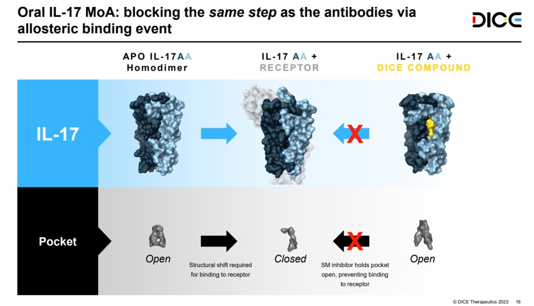 口服 IL-17 小分子抑制剂通过变构结合,与抗体药发挥相似效应。