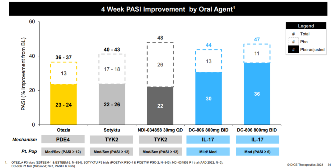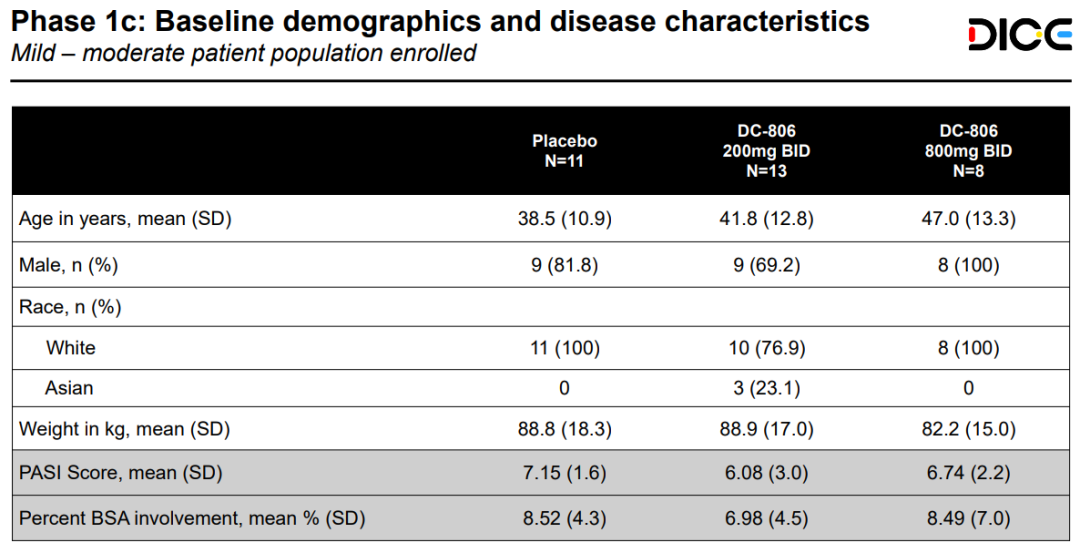 DC-806 属于靶向 IL-17 的口服小分子抑制剂,I 期临床研究显示,安全性良好,显示出一定疗效。在几十例体重偏轻(不到 90 kg)轻中度 PsO 里面(PASI 均值不足 10 分,BSA 均值不足 10%),DC-806 每日两次 800 mg 给药,4 周 PASI 较基线降低 44%,数值上和 PSO 获批的小分子靶向药——BMS 的 TYK2 抑制剂 deucravacitinib 相近。总体来讲,这个疗效大体在一代生物制剂的水平(anti-TNF 单抗和乌司奴单抗),大概率较难与二代生物制剂比肩。