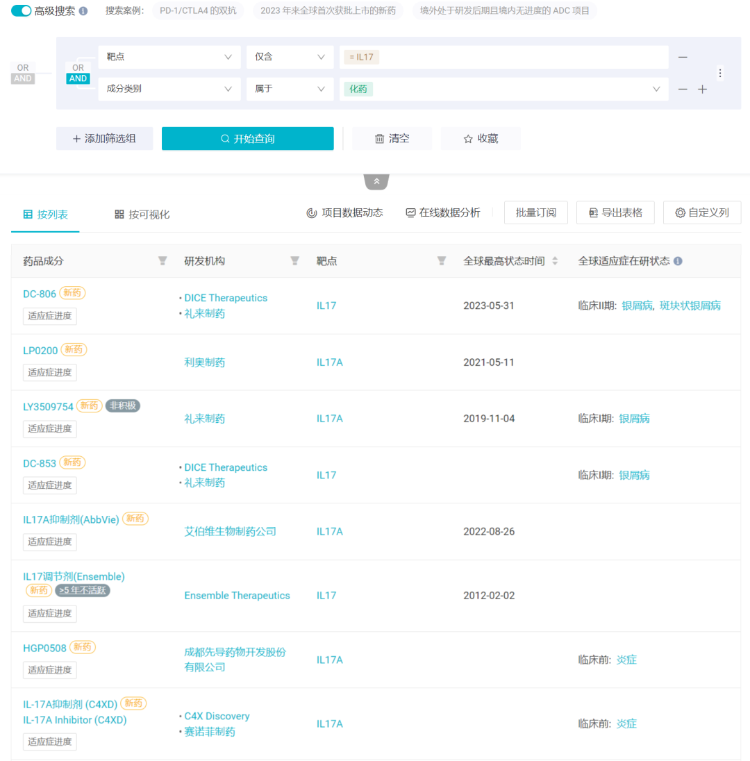 实际上据 Insight 数据库显示,礼来也曾开发过靶向 IL-17A 的小分子化药 LY3509754,在 2019 年启动一项联用 PD-1 激动剂治疗银屑病的 I 期临床,不过由于肝脏问题已经终止,通过收购引进的 DC-806 和 DC-853 正好补位。