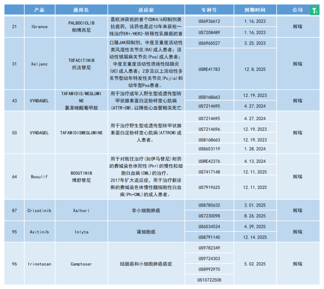 不仅是乳腺癌领域,治疗非小细胞肺癌的Crizotinib(赛可瑞),肾细胞癌的Axitinib(英立达),结肠癌和小细胞肺癌的Irinotecan(开普拓)等多个抗肿瘤药物也将于2025年直面多项专利到期。