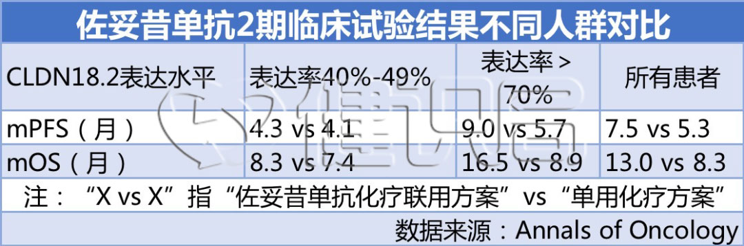 CLDN18.2的靶向药要发挥作用,需要与肿瘤细胞结合,但如果患者CLDN靶点表现不突出,佐妥昔单抗的效果就会大打折扣。安斯泰来2期临床研究发现,如果CLDN18.2表达率在40%至69%,佐妥昔单抗联用化疗方案给患者的改善不到一个月。
