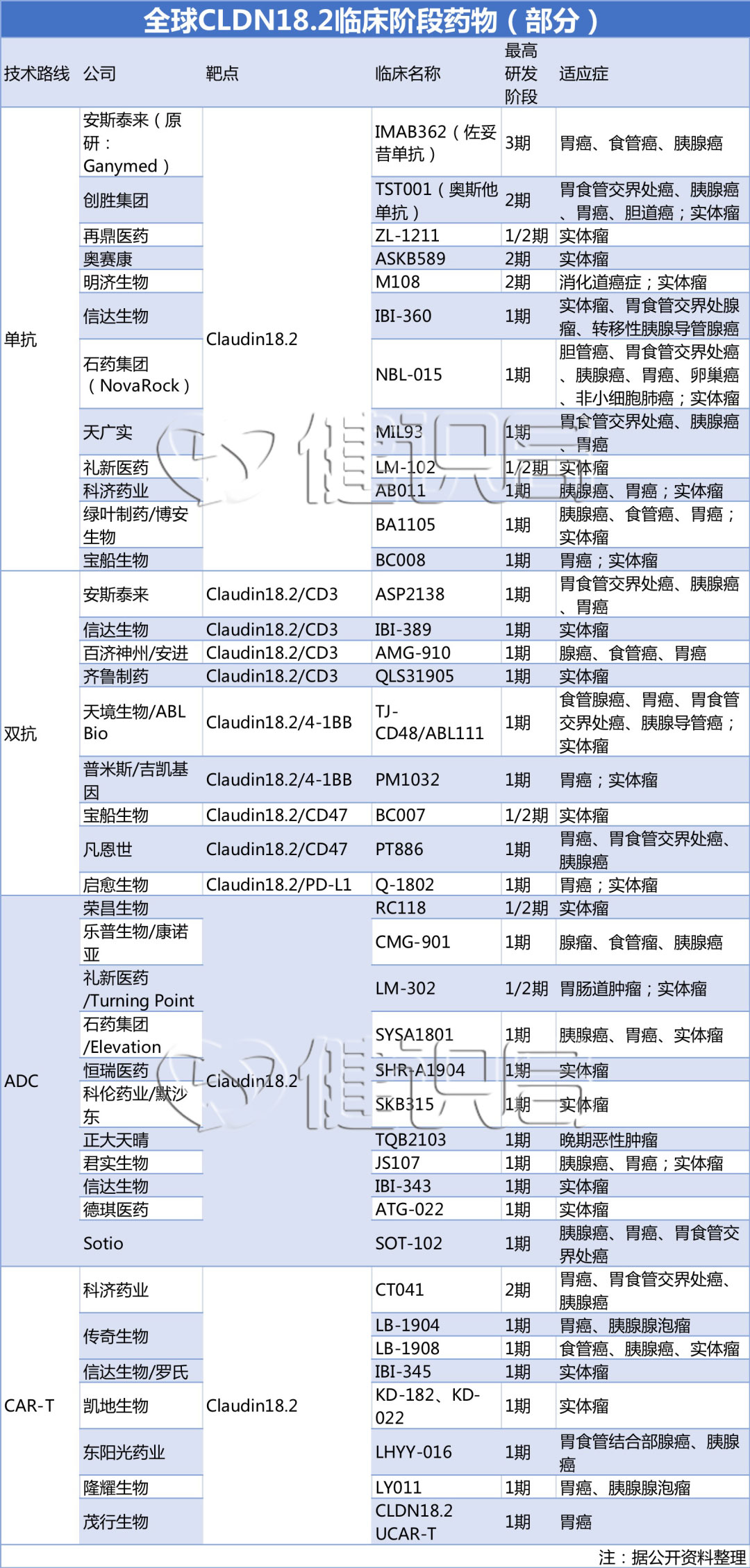 围绕CLDN18.2靶点的开发,国内已成群雄割据态势:单抗、双抗、ADC、CAR-T一个不少。国外,BioNtech正在开发CAR-T疗法和RNA疫苗的联用,其中也包括了CLDN18.2。