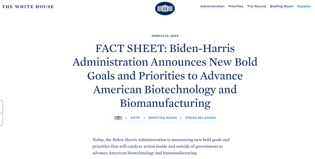 2023年3月,作为行政令新“续集”,拜登政府颁布《美国生物技术和生物制造的明确目标》[1]算是对去年的计划做了回应与补充,从几项“大胆”又令人震撼的数据中看得出拜登政府为始终保持“竞争优势”的决心。
