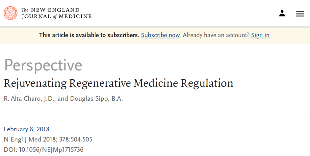 [3]Charo RA, Sipp D.Rejuvenating Regenerative Medicine Regulation. N Engl J Med 2018;378:504-5.