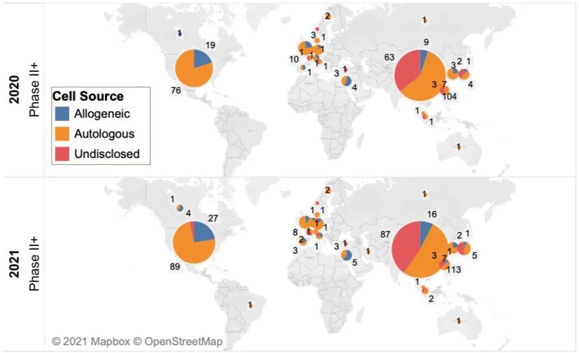 △ 全球细胞治疗药物处于 II、III 期和上市的管线分布