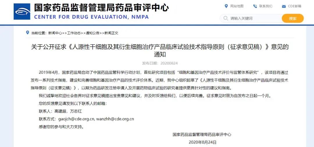 △ 2020年8月4日,国家药品监督管理局药品审评中心组织起草了《人源性干细胞及其衍生细胞治疗产品临床试验技术指导原则(征求意见稿)》,以期为药品研发注册申请人及开展药物临床试验的研究者提供更具针对性的建议和指南
