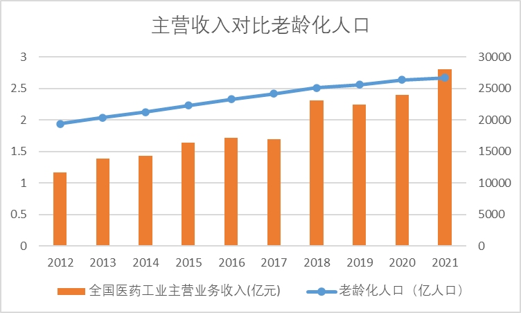 从图1显示的曲线来看,自2012年以来至2021年的十年期间,老龄化人口曲线一直处于持续稳定增长的走势。但是,对比部分关键时间节点,主营业务收入出现了一定波动: