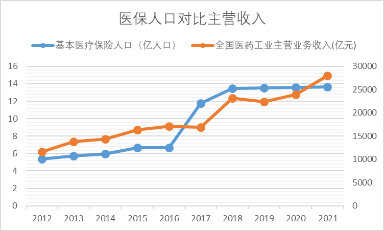 除了GDP的增长外,基本医疗保险的覆盖率和医保基金收入也与医药行业的增长有着正相关的关系。