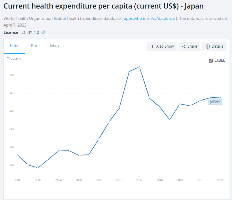 图5:日本人均医疗费用支出变化(2000-2021年)