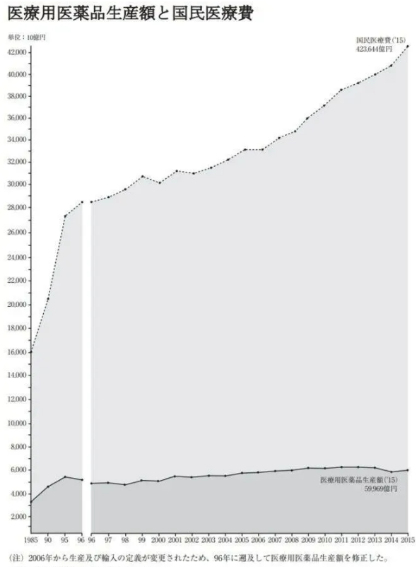图6:日本国民医疗费用总额与医疗用医药产品生产总额对比