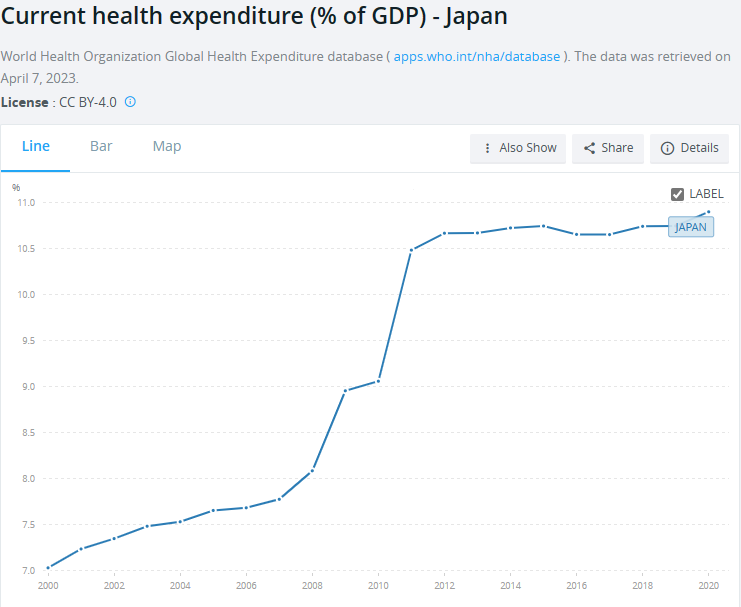 对比之下,医疗费用总支出占比GDP的曲线似乎更加契合日本国民医疗费用总额的曲线变化。根据图7变化显示,日本的医疗总支出占比GDP在2008年至2012年前后飞速提升,并于2013年开始区域平缓。恰好与图6中的国民医疗总支出的增长曲线接近,在2008-2012年期间增速有所加快。