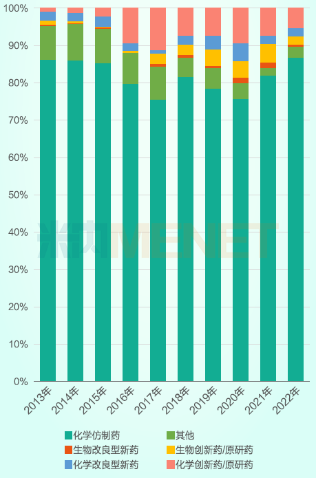 2013-2022年CDE申报上市受理号中创新药及改良型新药占比