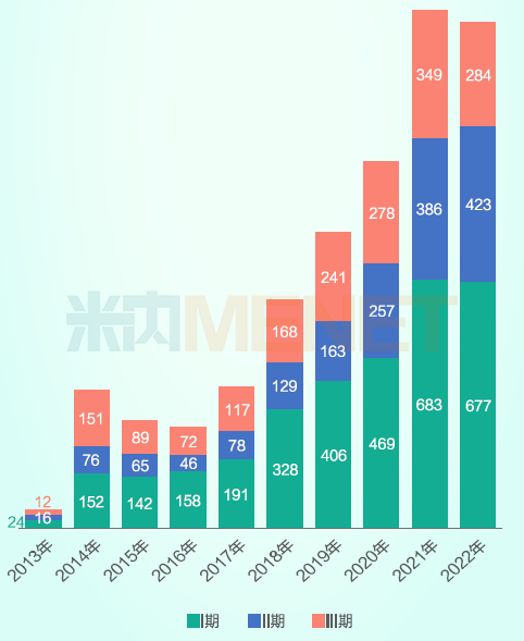 随着创新药IND申报数的增加,进入临床试验的新药数量也有明显提升。米内网中国临床试验数据库显示,2017年后在NMPA临床试验公示平台登记开展的临床试验数上了一个新台阶,2021年I至III期临床试验登记数合计达到1418件,同比增长超40%,2022年亦超过1400个,基本形成新常态。