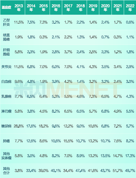 2013-2022年间国内开展I至III期临床试验数最多的适应症TOP10