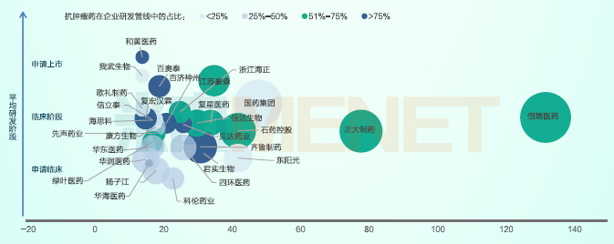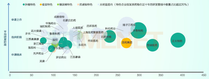 注:(1)按集团进行汇总统计,品种数量统计剔除原料药;(2)平均研发阶段为企业申报的所有药品在国内最高研发进度的加权平均值;(3)已上市品种数量为气泡大小;(4)申报品种含申报临床与申报上市、含创新药与仿制药。