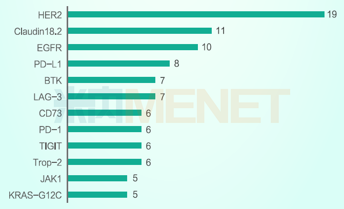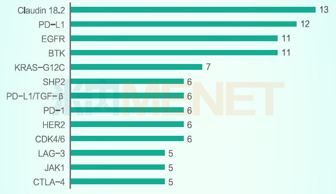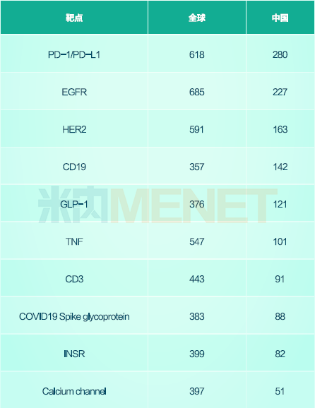 全球在研药物数量最多的靶点TOP10及中国在研药物数量