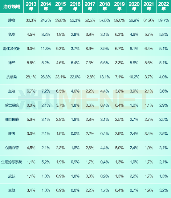 2013-2022年国产IND和NDA的1类新药按治疗类别分布情况