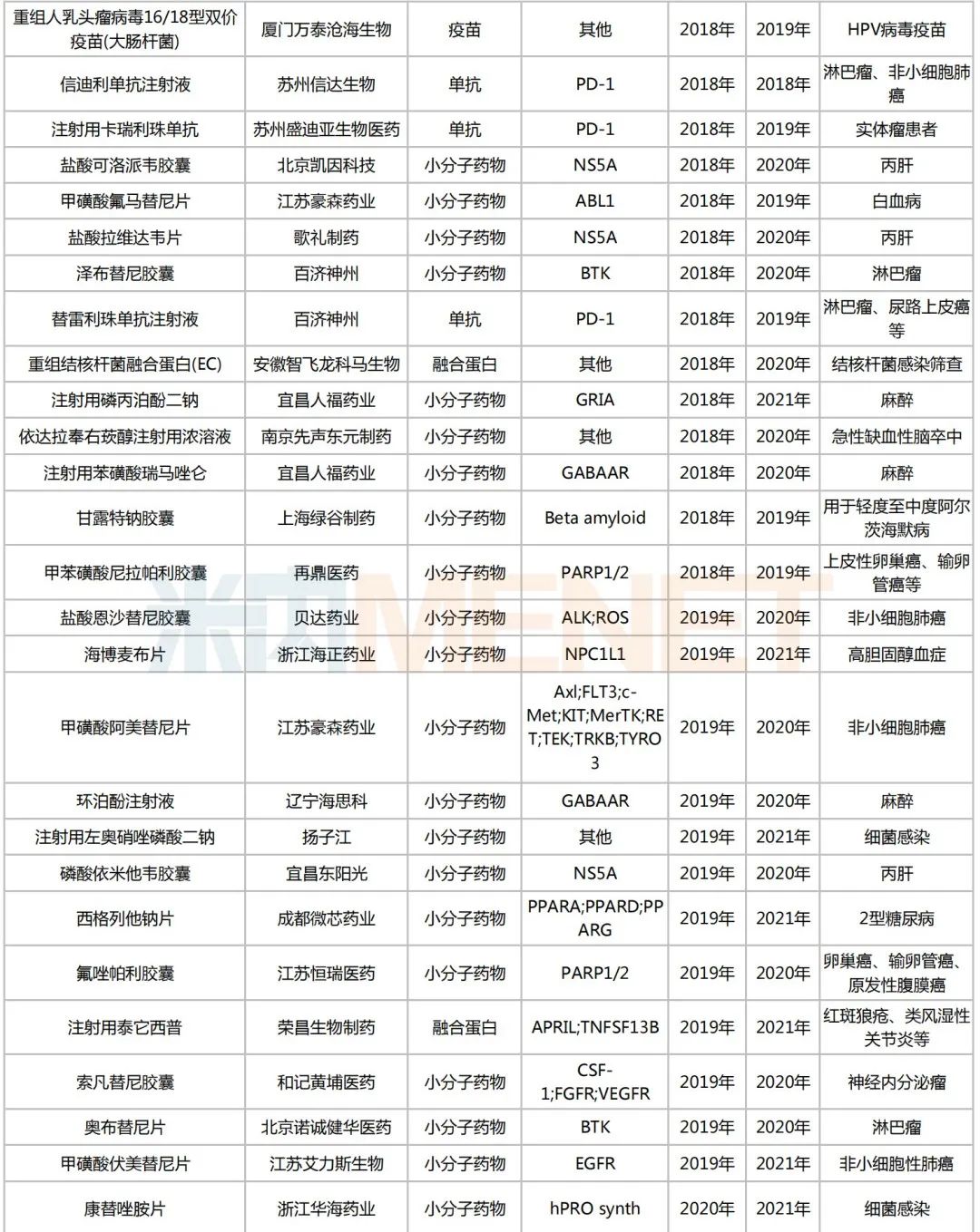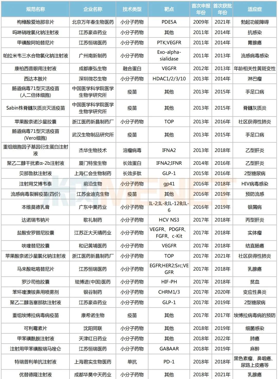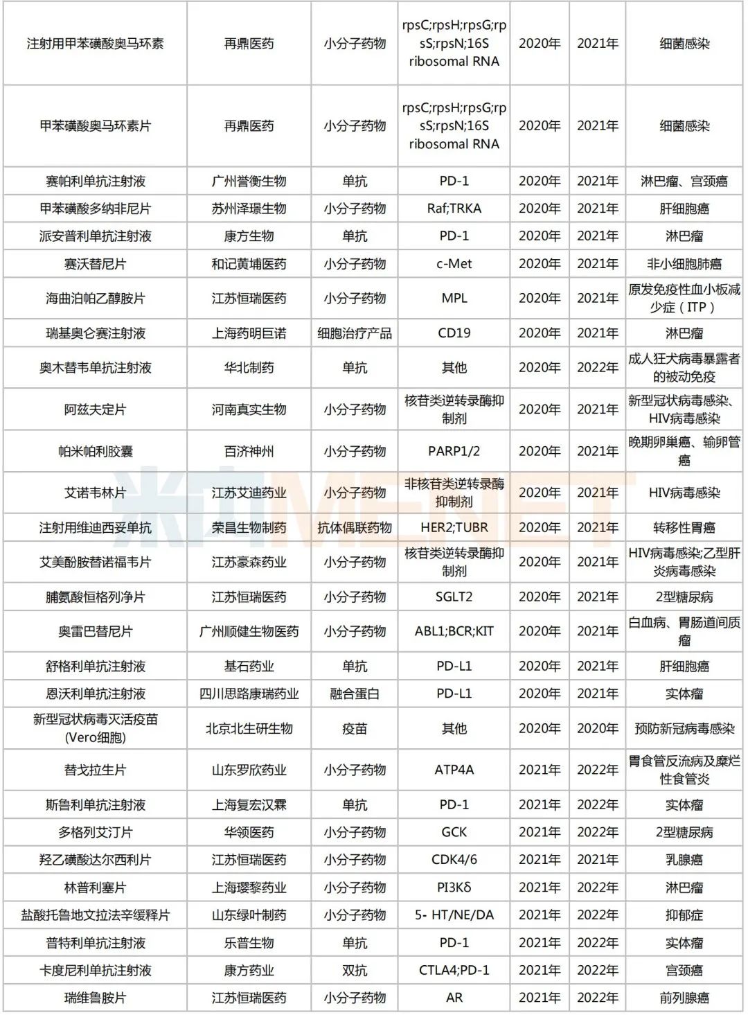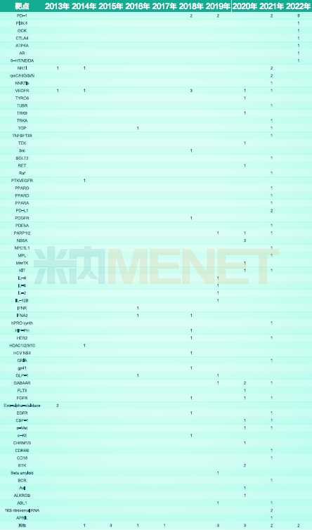 2013-2022年获批的国产1类新药涉及的近70种靶点情况