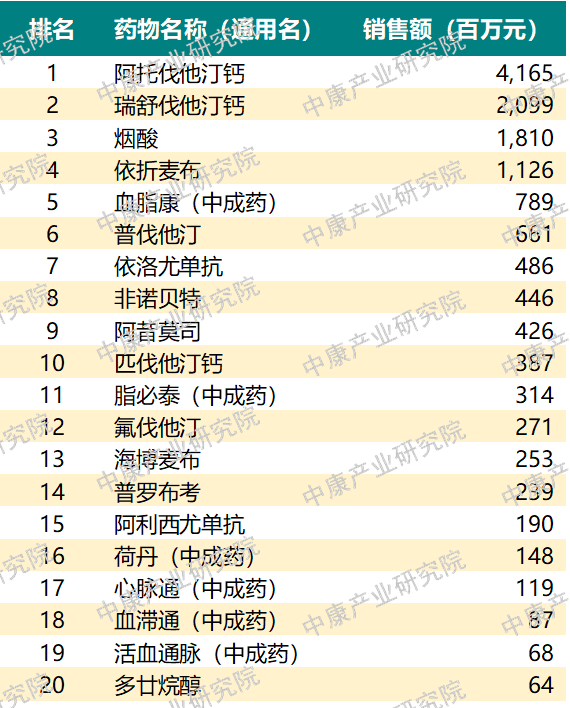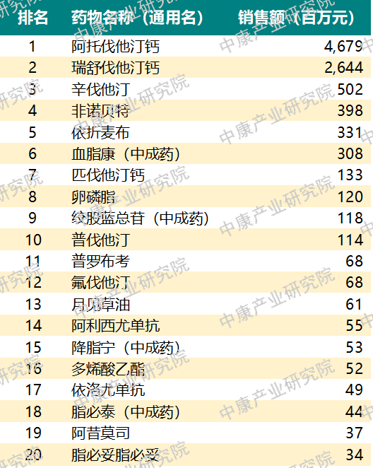 表1:2022年降脂药物国内等级医院销售额TOP20