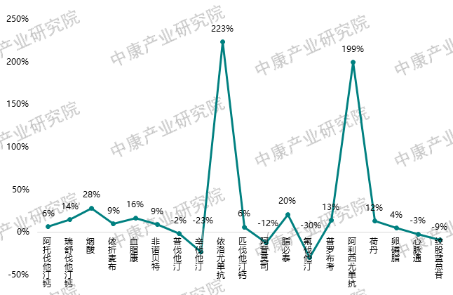 综合等级医院和零售终端数据来看,阿托伐他汀钙和瑞舒伐他汀钙站占据了降血脂药物超过50%的市场份额。和去年相比,2021年6月上市的海博麦布增速情况最为猛烈,增长率达到7位数,上市仅1年半就拥有超过2亿多的份额。新型的PCSK9生物制剂依洛尤单抗和阿利西尤单抗的增长率分别为223%和199%,增速亮眼,延续新药替代老药的趋势。