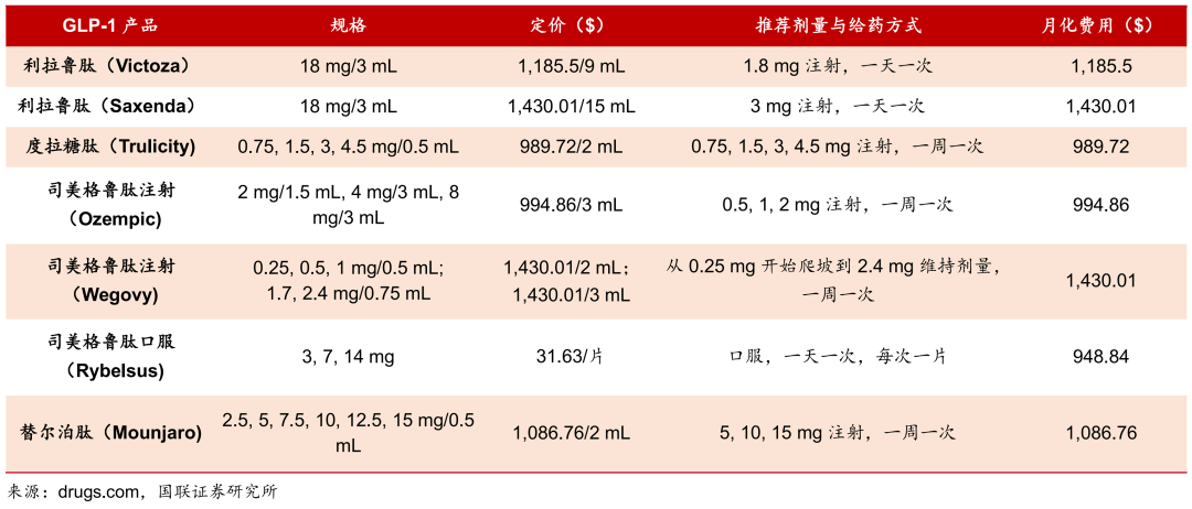 GLP-1RA 产品规格和美国销售价格
