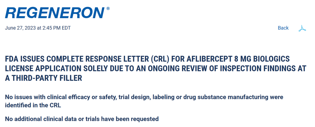 6月27日,再生元(纳斯达克:REGN)宣布,已收到FDA就阿柏西普8mg制剂的上市申请发出的完整回复函(CRL)。公司表示,FDA此次拒绝批准是因为在第三方药物灌装机中发现了生产问题。与疗效、安全性、说明书和原料药生产等方面无关,也未要求提供额外的临床数据或额外开展试验。