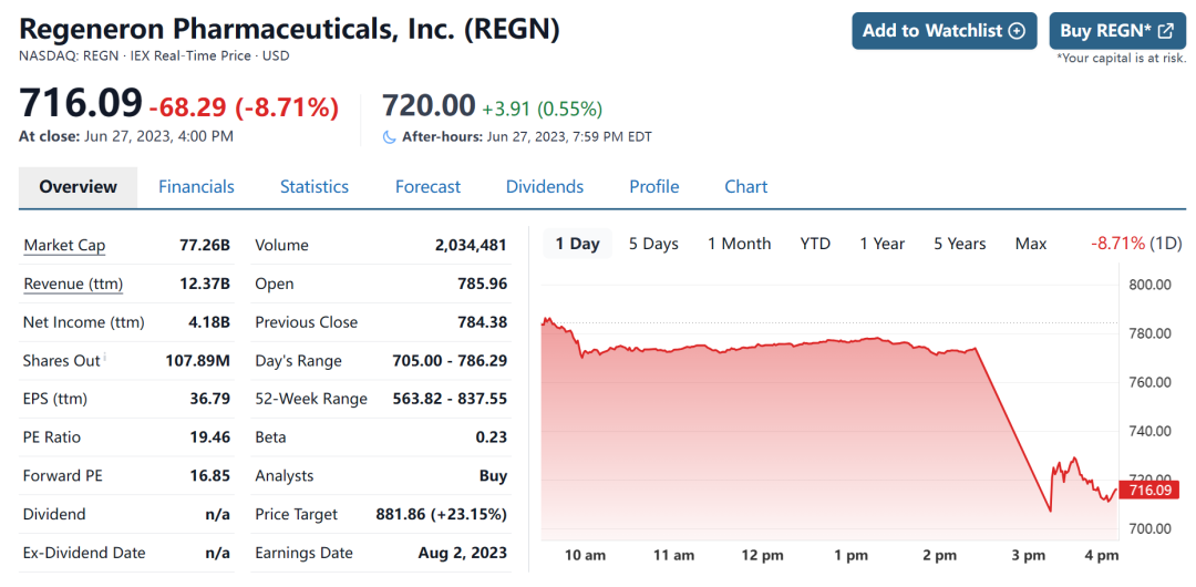 受此消息的影响,再生元的股价下跌近9%,目前市值786亿美元。根据财联社最新报道,再生元股票暂停交易,等待消息发布。