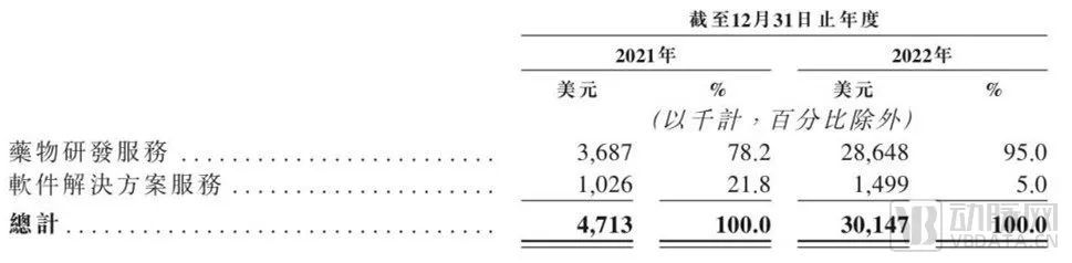 英矽智能的经营数据在2021年至2022年间的另一重关键变化在于,早期的软件业务进一步压缩。根据招股说明书,2021年至2022年间,英矽智能的软件解决方案服务收入占比从21.8%降低至5%,对应的则是药物研发服务收入占比大幅提升。