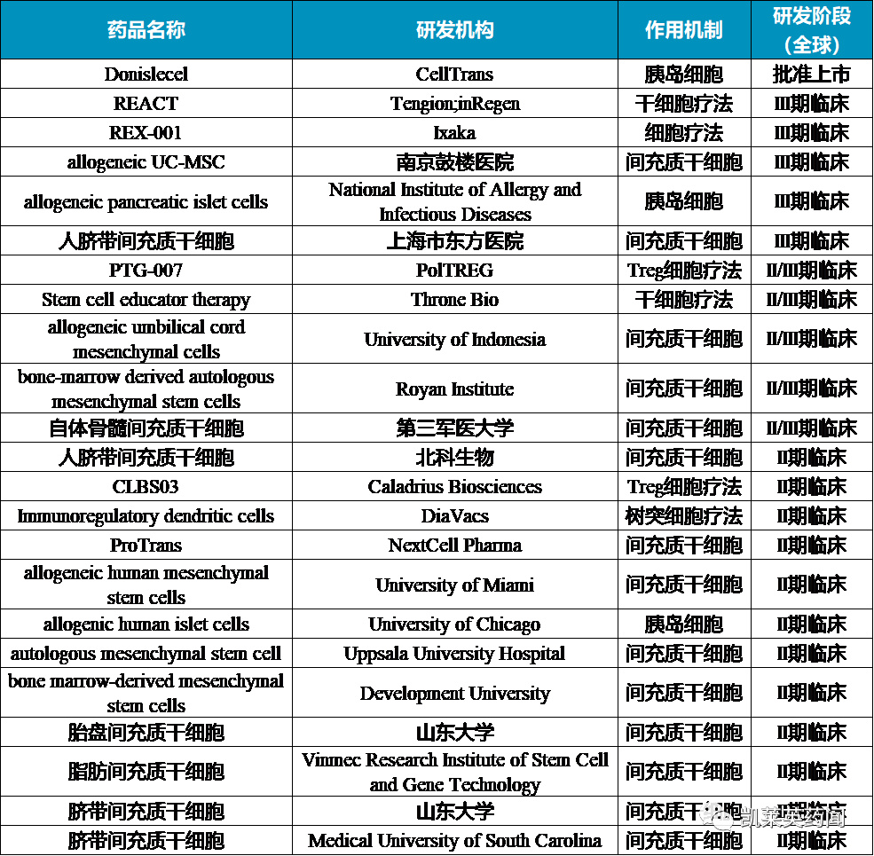 据不完全统计,目前在研的糖尿病细胞疗法约90余种,将II以上临床阶段的药物统计如下: