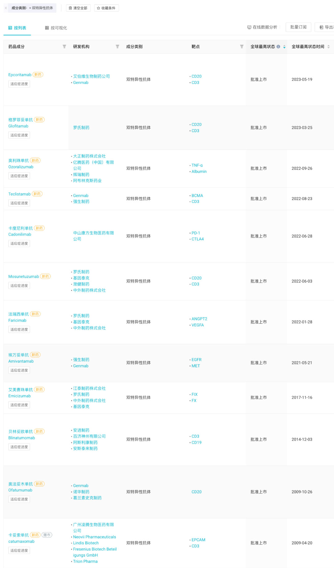 全球获批上市 12 款双特异性抗体