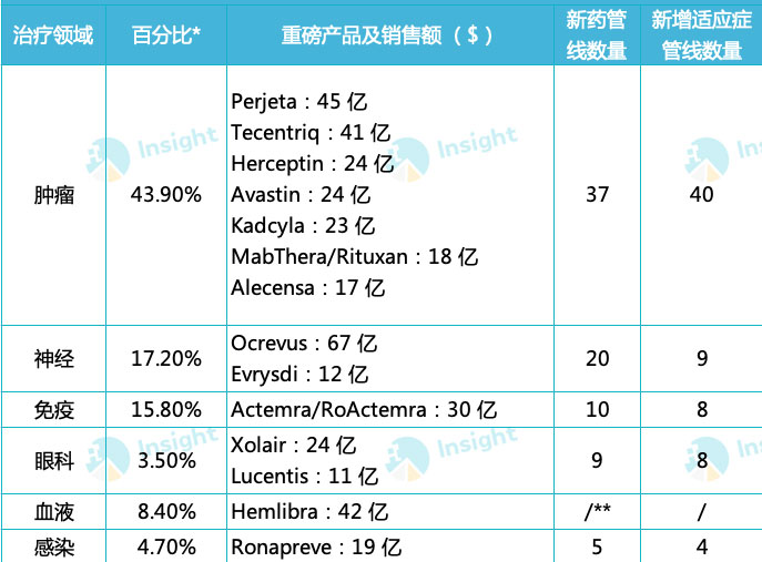 参考来源:罗氏 2022 年报及罗氏官网(PS:*2022 年销售额占药品总销售额百分比;**血液领域管线部分合并在了肿瘤领域;内容为人工整理,如有纰漏,请指正)