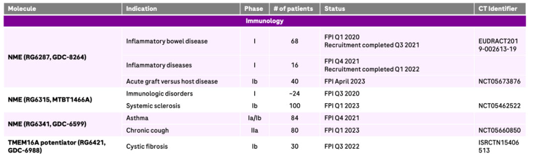 罗氏同时也专注于严重呼吸道疾病及自身免疫性疾病。罗氏 2022 年免疫领域早研管线
