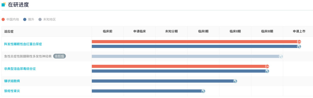 长效 C5 补体抑制剂珂罗利单抗(Crovalimab/RG6107)正处于上市申请阶段,用于治疗阵发性睡眠性血红蛋白尿症(PNH),这是一款首发中国的新药,目前正在审评中。罗氏还在评估珂罗利单抗在镰状细胞病、狼疮性肾炎等疾病中的治疗潜力。