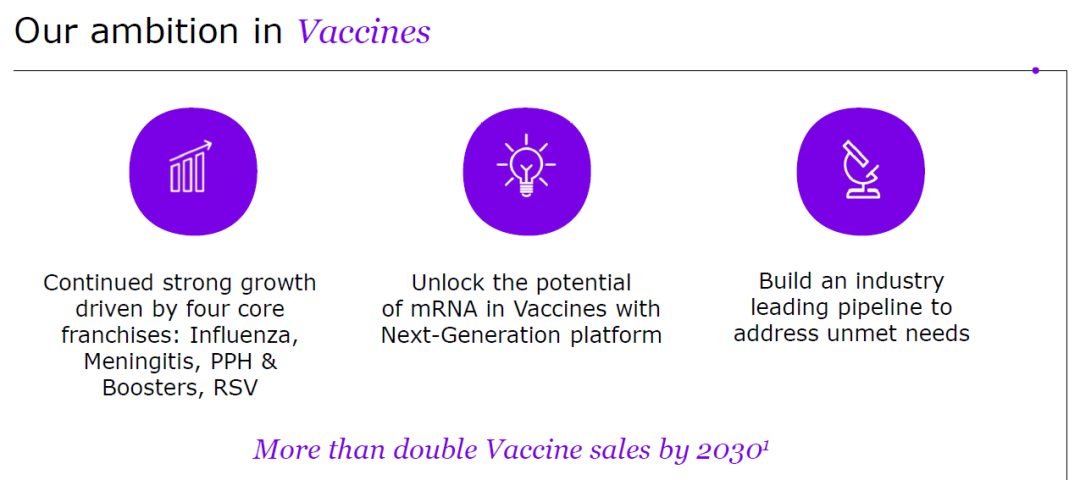 赛诺菲疫苗板块,传统优势产品保持稳定增长(包括流感、脑膜炎、脊髓灰质炎/百白破/Hib、RSV)、新型mRNA疫苗技术平台、拓展临床空白的疫苗领域。目标到2030年疫苗产品销售额翻倍,超过100亿美元。