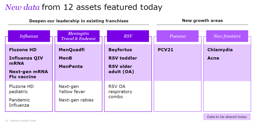 此次重点介绍了12款疫苗产品,包括流感、脑膜炎、RSV、肺炎、衣原体、痤疮。