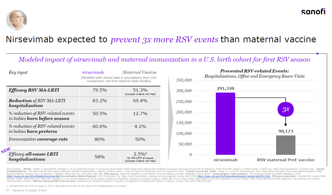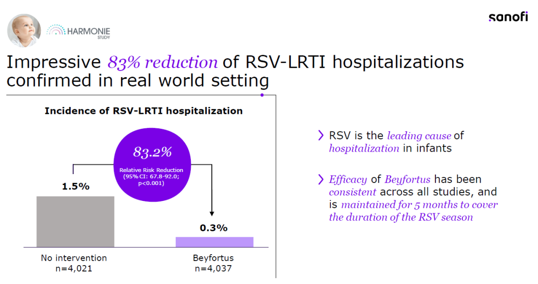 赛诺菲Nirsevimab接种新生儿可以将RSV相关下呼吸道症状住院率降低83%,预计比孕妇接种RSV疫苗有效率高出3倍。